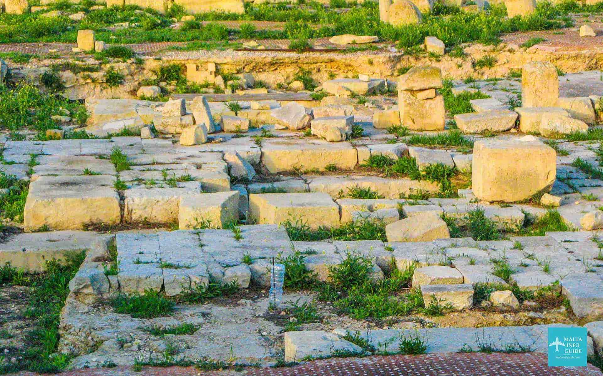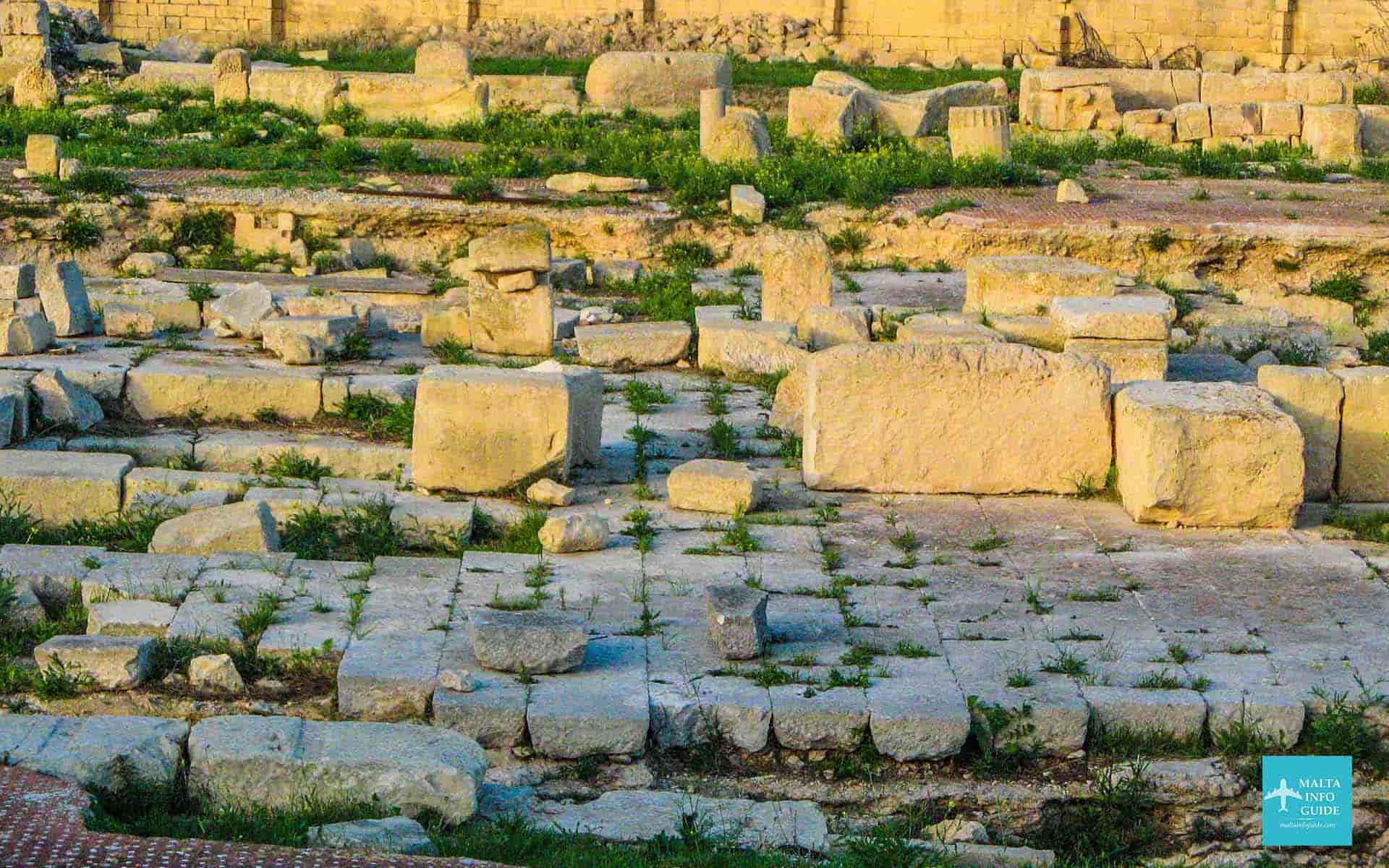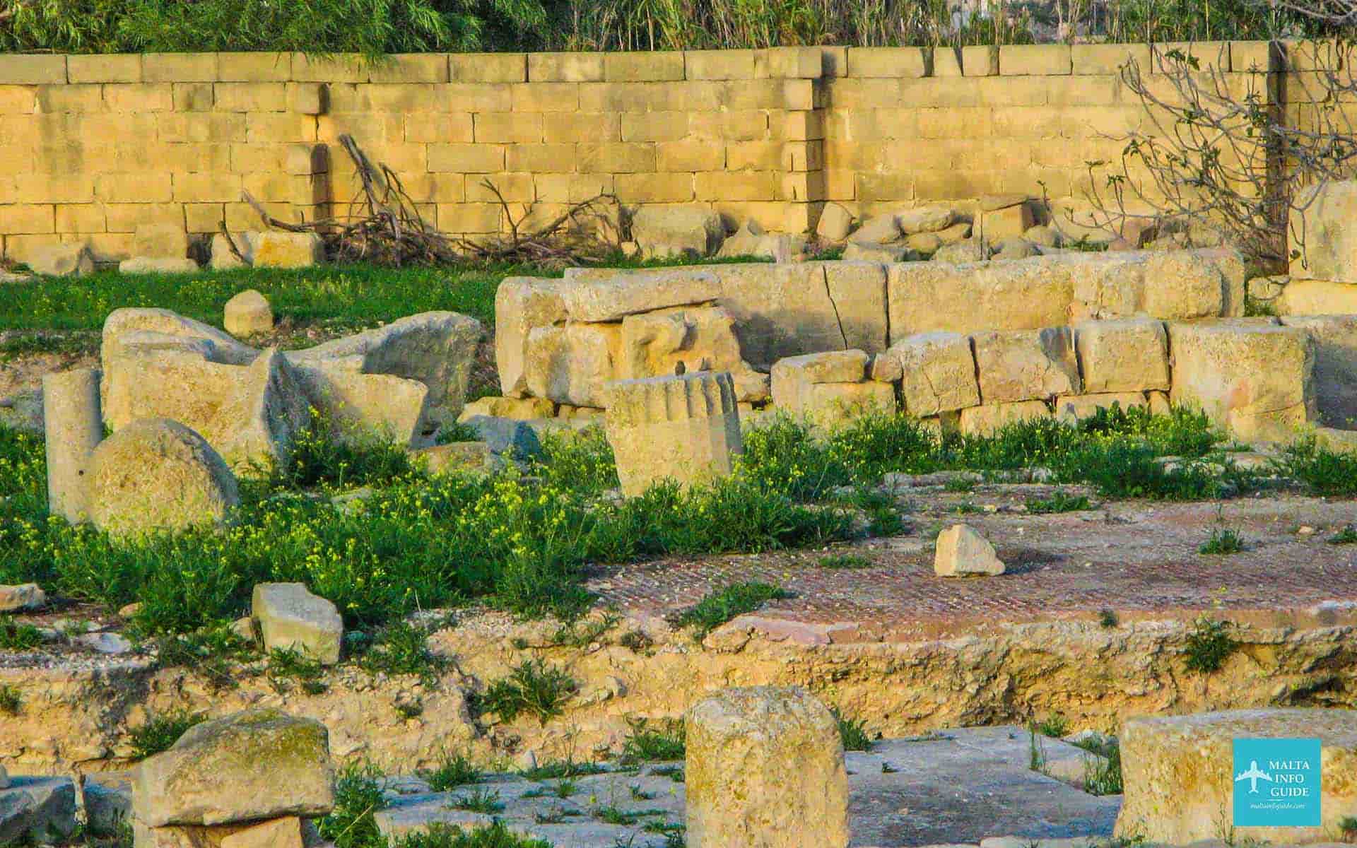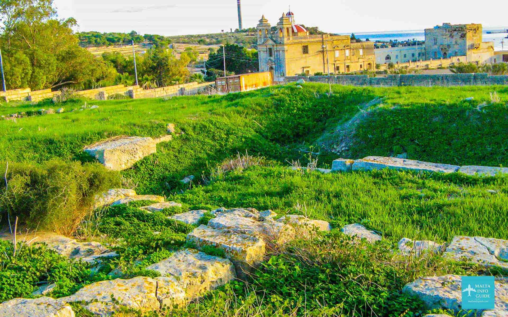 A fourth century monastery found at this site revealed a prehistoric D-shaped setting of large blocks, the foundation of the outer wall of a four-apse temple of the Tarxien temple phase.